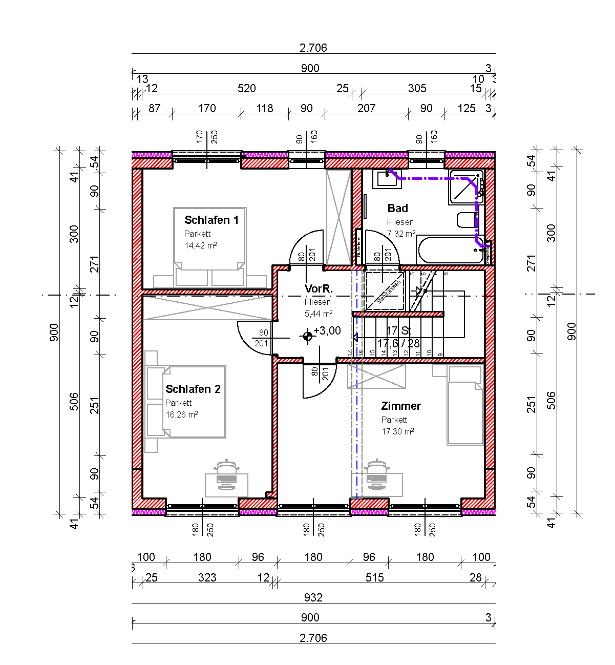 Im Obergeschoss befinden sich drei gut geschnittene Schlafzimmer zwischen 14,4 und 17,3m² – perfekt für Eltern und Kinder.