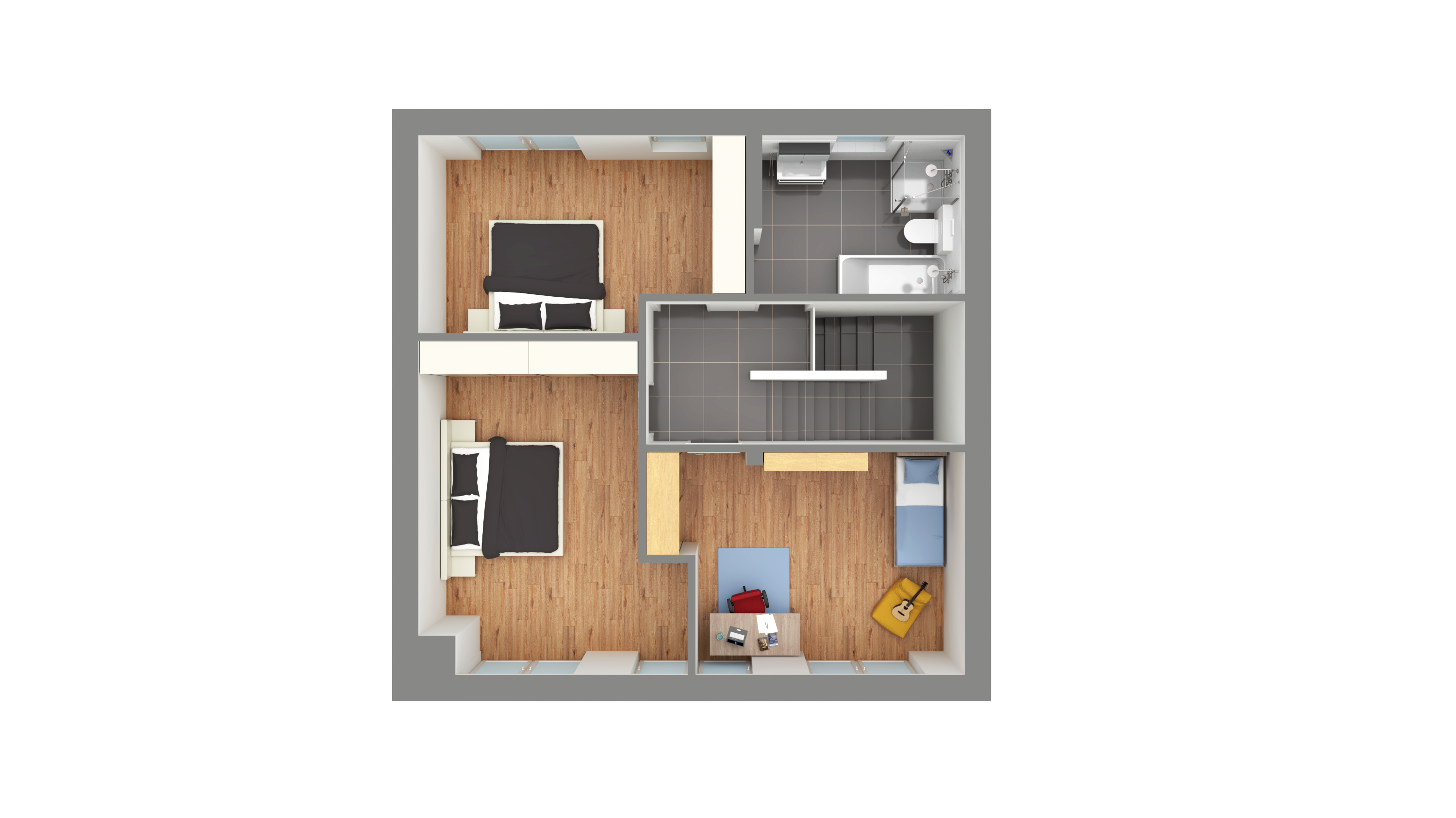 Jedes Zimmer wurde so geplant, dass ein Doppelbett problemlos Platz findet. Das Elternzimmer bietet zudem ausreichend Fläche, um einen Schrankraum zu integrieren – ideal, um Ordnung und Übersicht im Alltag zu bewahren.