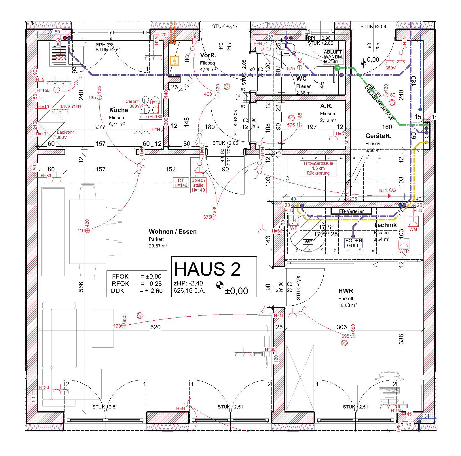 Aus Kostengründen – und weil moderne Heizsysteme heute kaum Platz benötigen – wurde bewusst auf eine Unterkellerung verzichtet. Das spart Geld, schafft aber dennoch alle nötigen Stauraummöglichkeiten direkt im Haus.