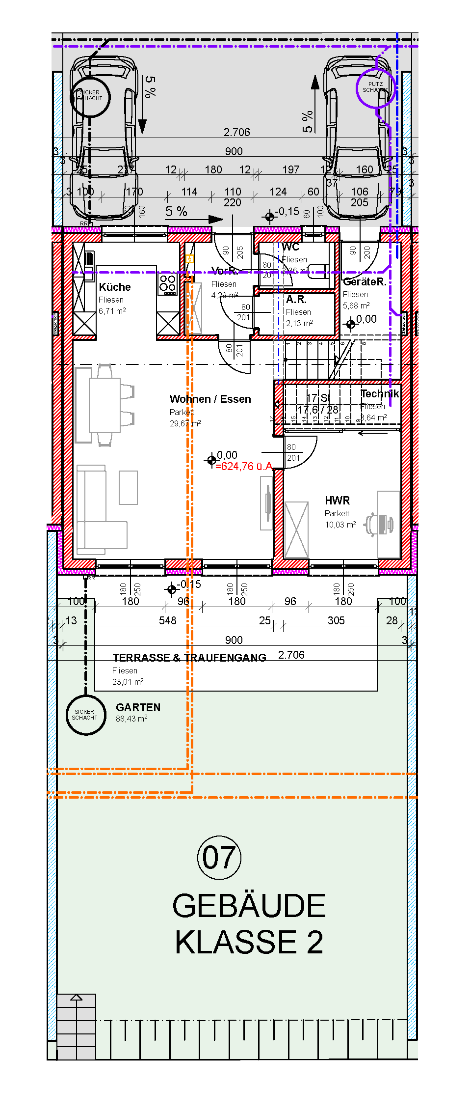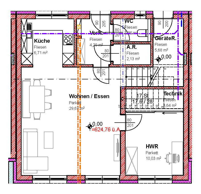 Aus Kostengründen – und weil moderne Heizsysteme heute kaum Platz benötigen – wurde bewusst auf eine Unterkellerung verzichtet. Das spart Geld, schafft aber dennoch alle nötigen Stauraummöglichkeiten direkt im Haus.