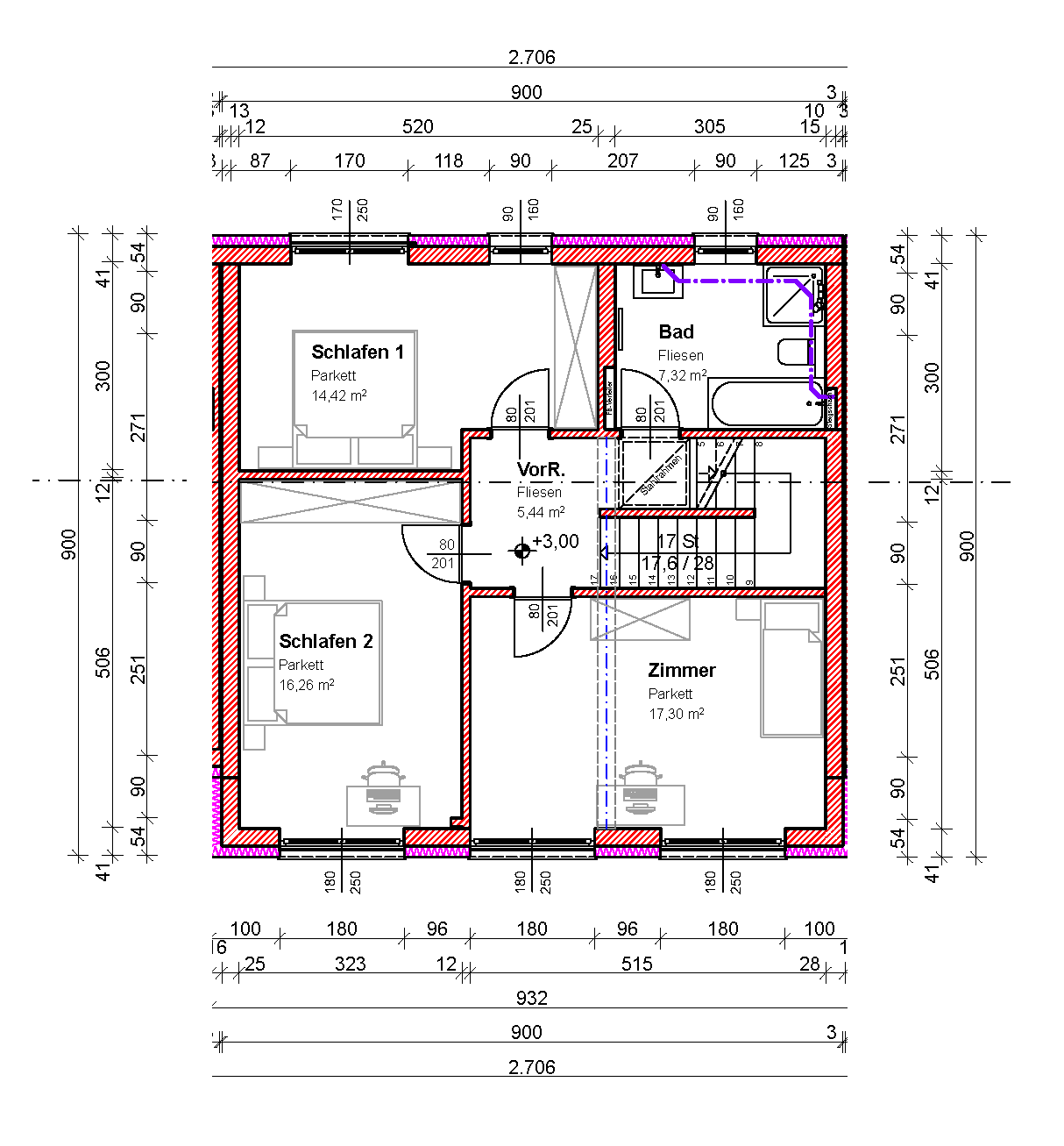 Jedes Zimmer wurde so geplant, dass ein Doppelbett problemlos Platz findet. Das Elternzimmer bietet zudem ausreichend Fläche, um einen Schrankraum zu integrieren – ideal, um Ordnung und Übersicht im Alltag zu bewahren.